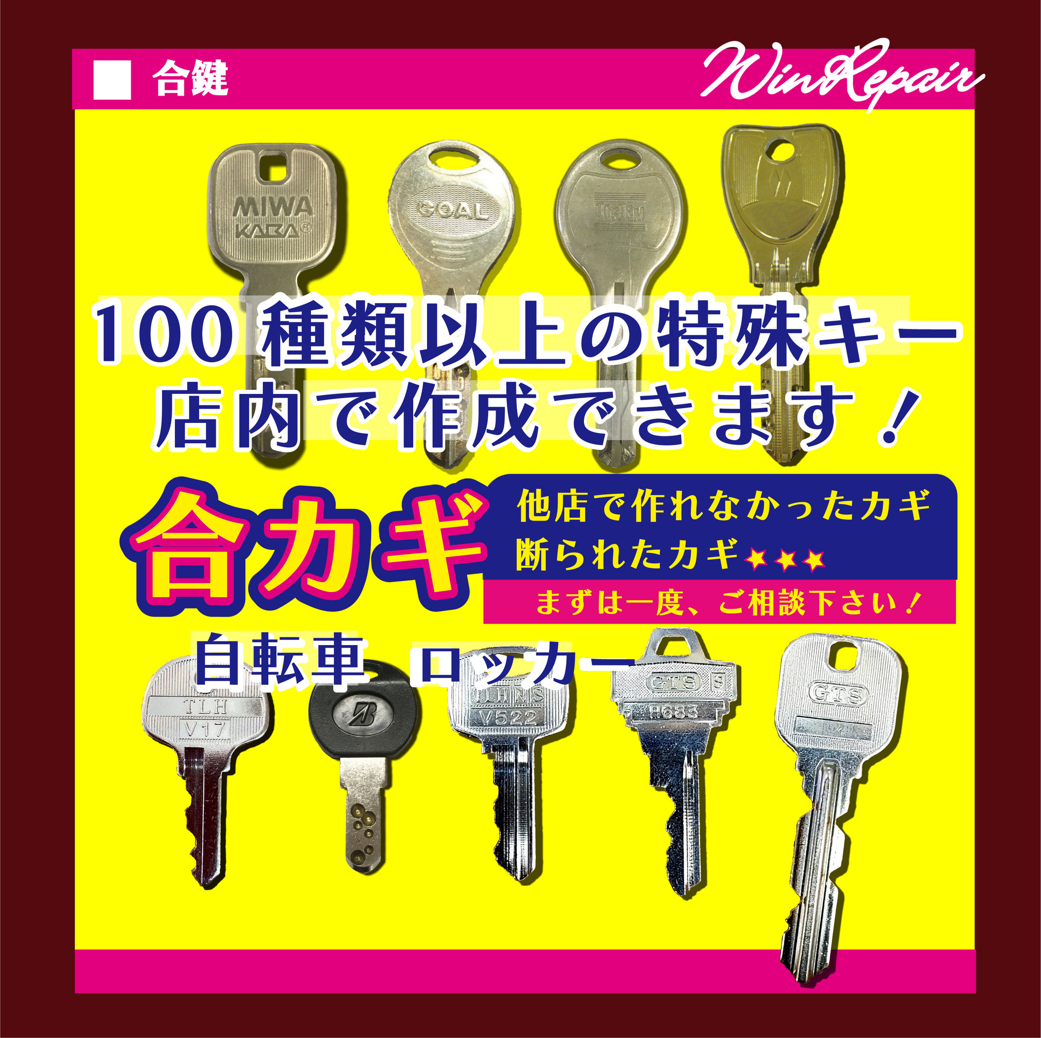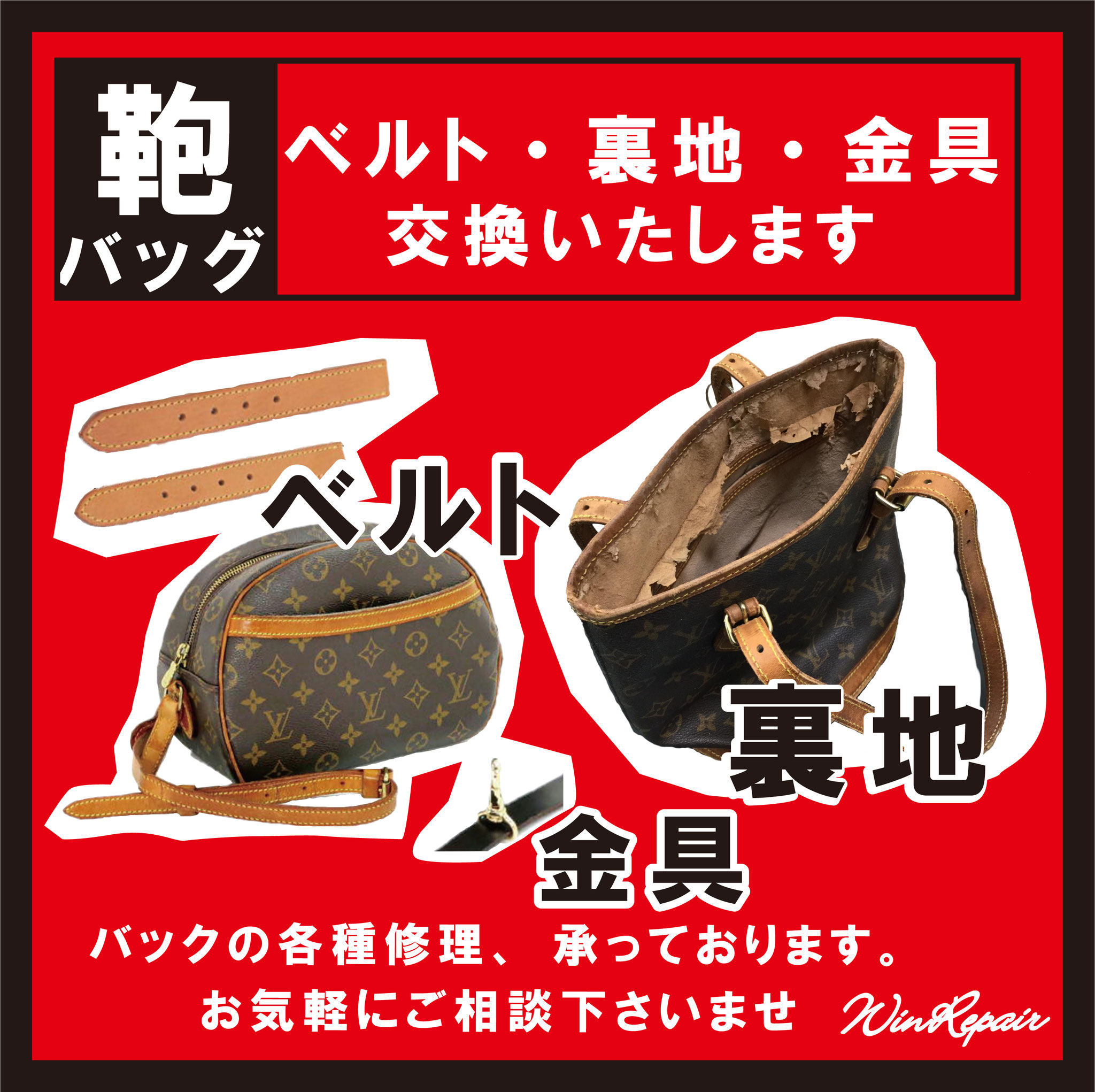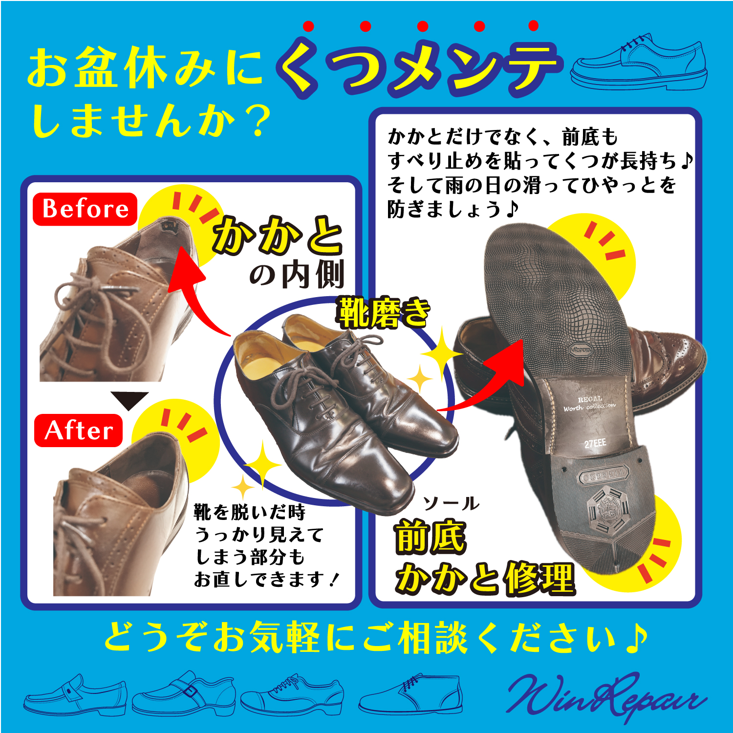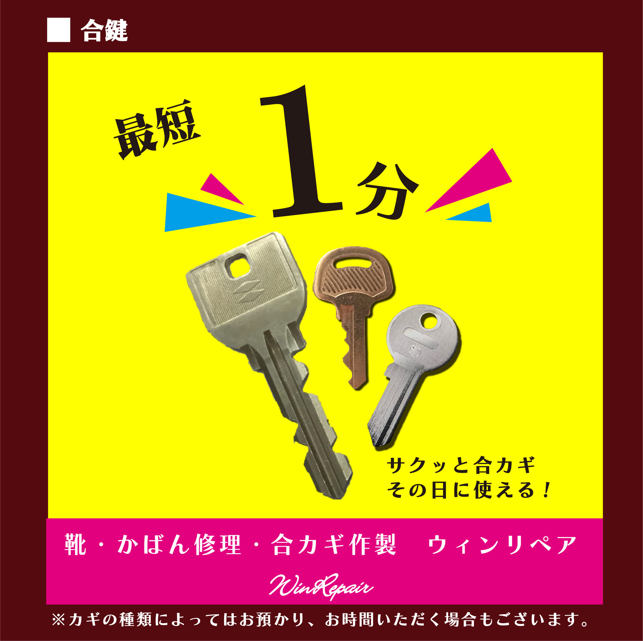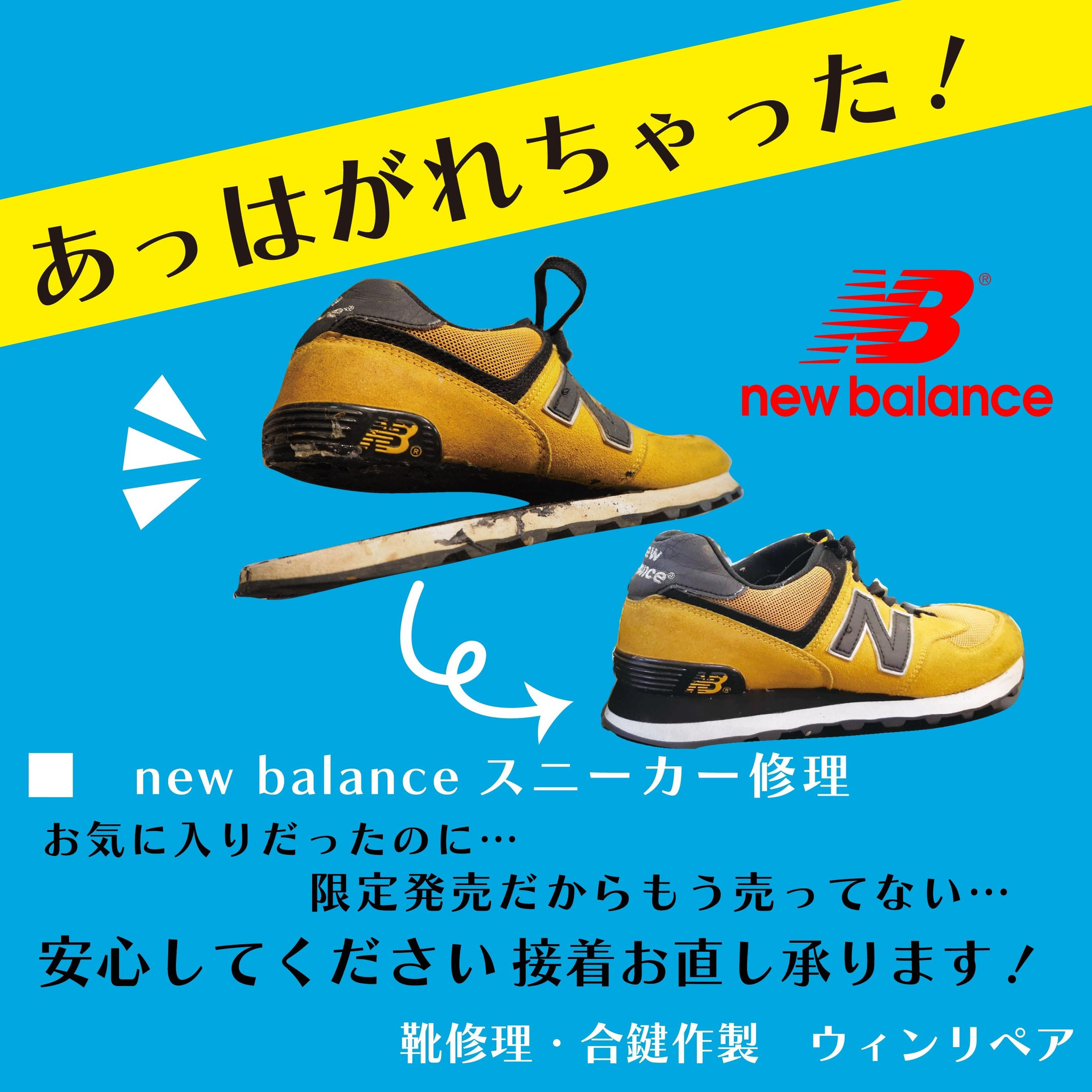 ウィンリペアは「靴」の修理をはじめとして、合カギ作製、カバンの修理、時計の電池交換など様々なサービスをお客様にお届けしています。