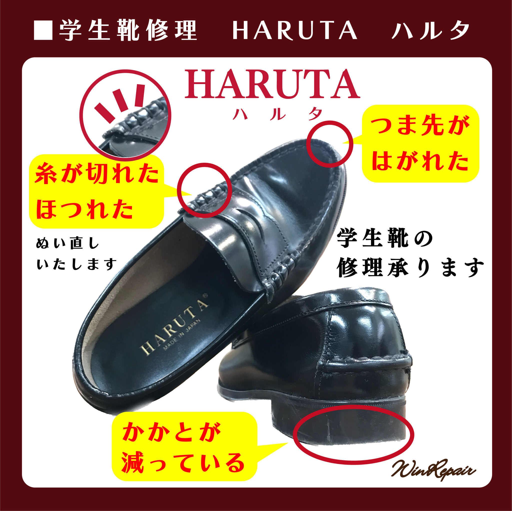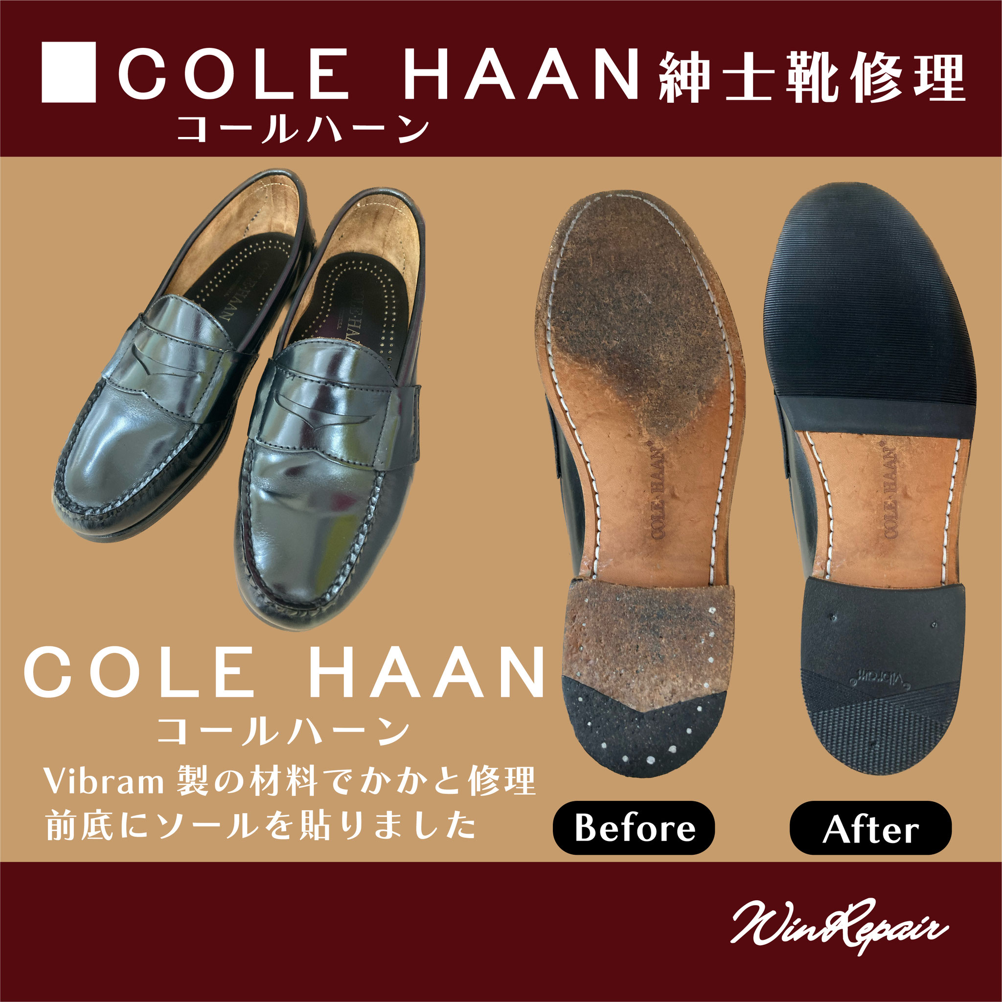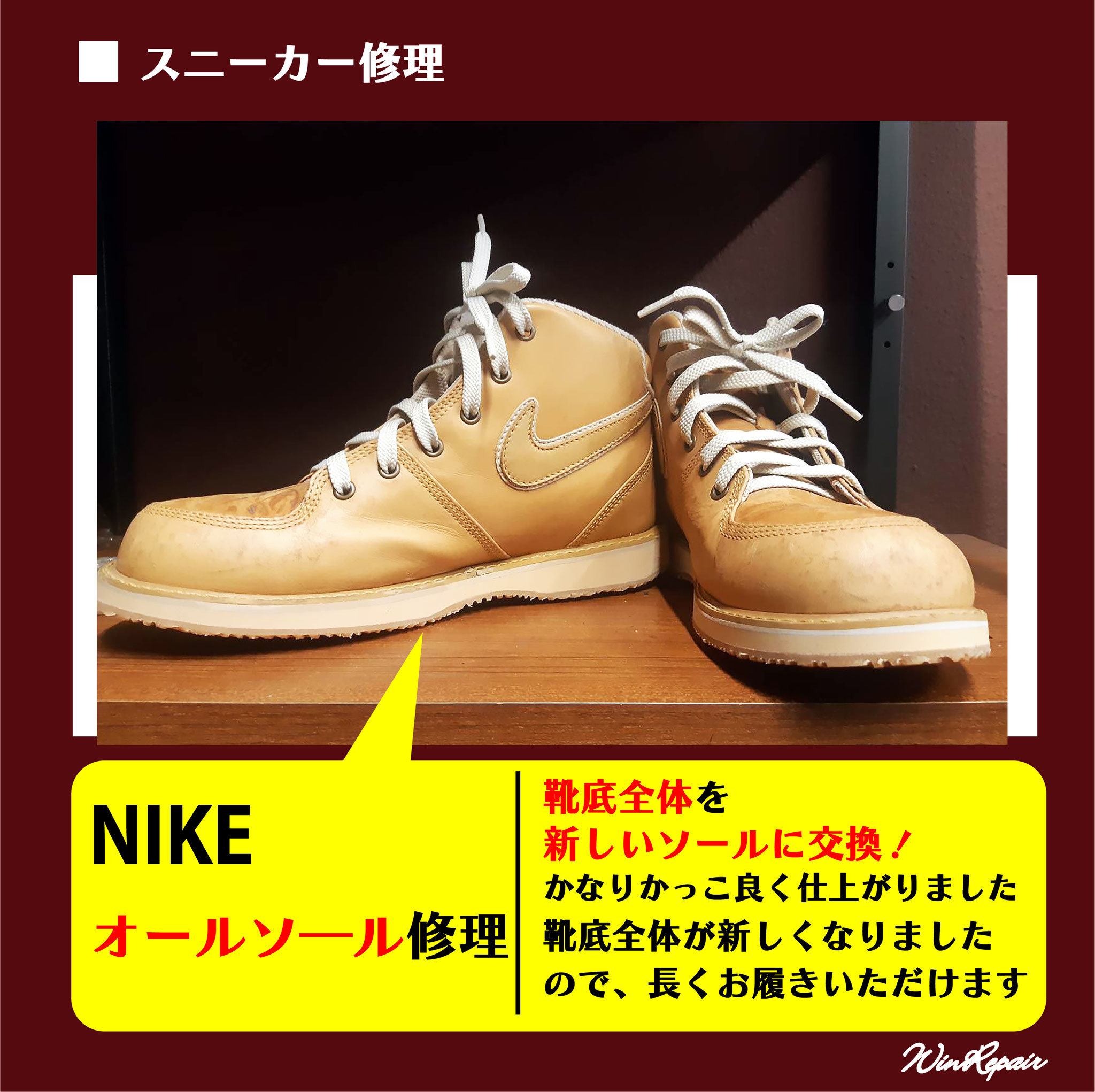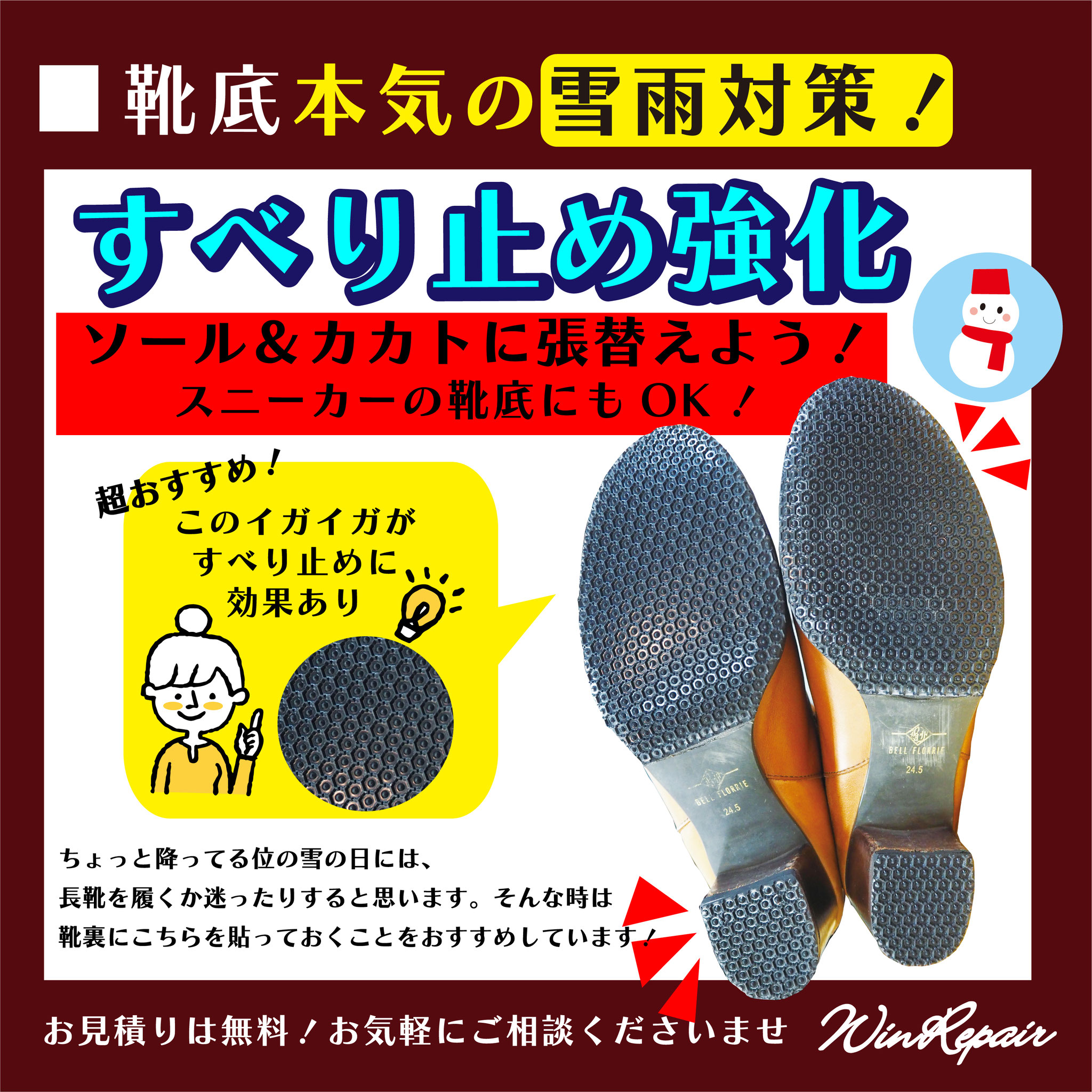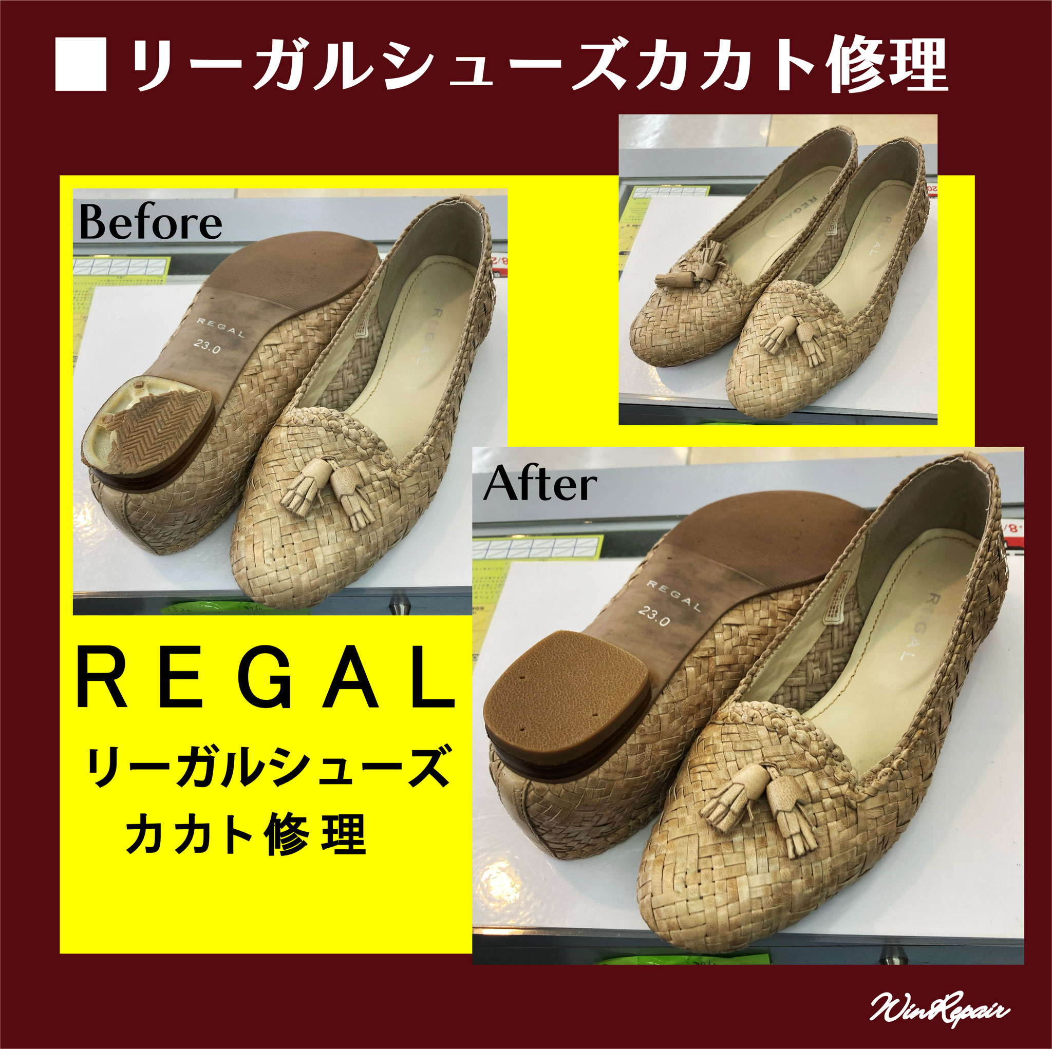 ウィンリペアは「靴」の修理をはじめとして、合カギ作製、カバンの修理、時計の電池交換など様々なサービスをお客様にお届けしています。