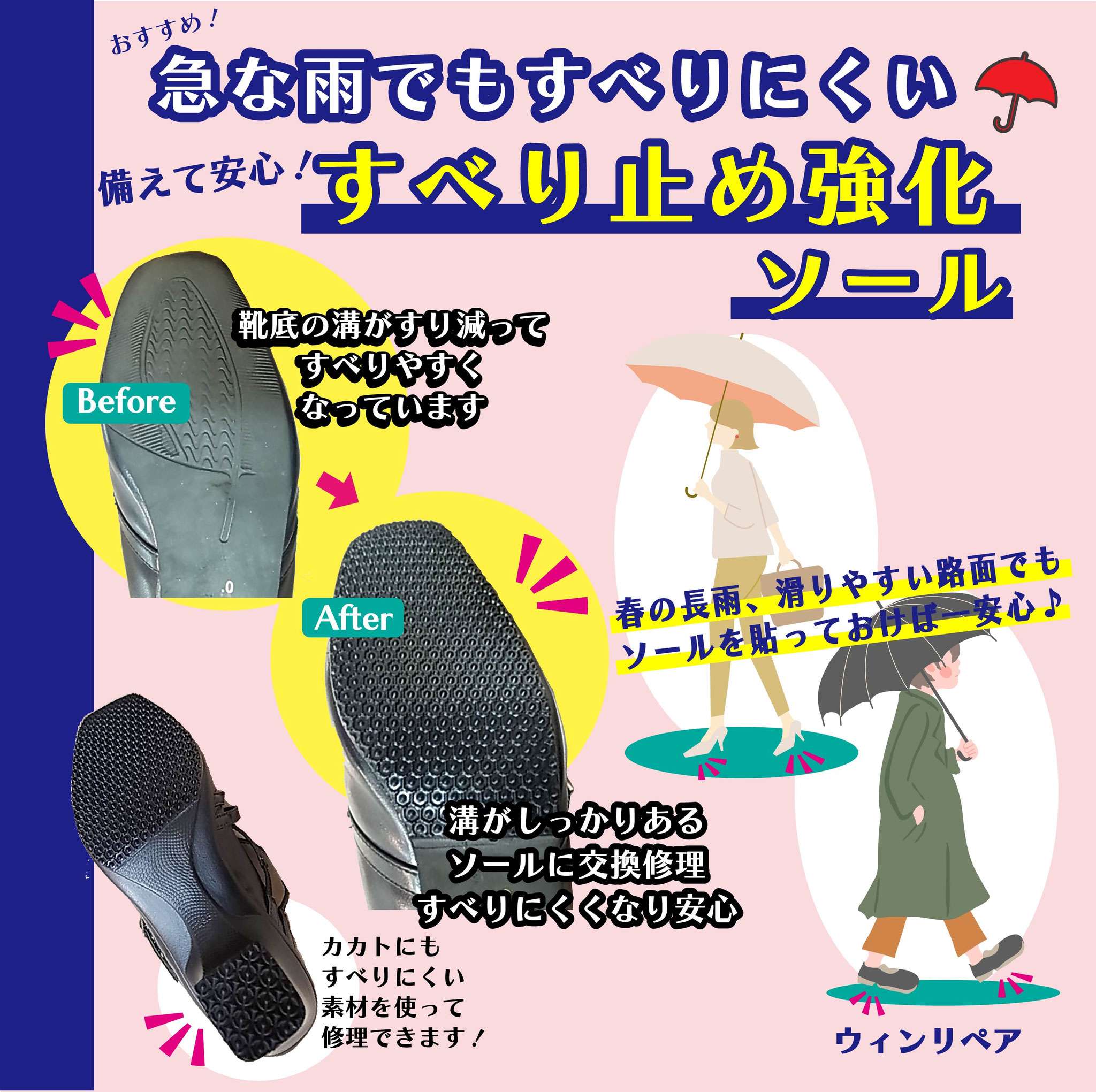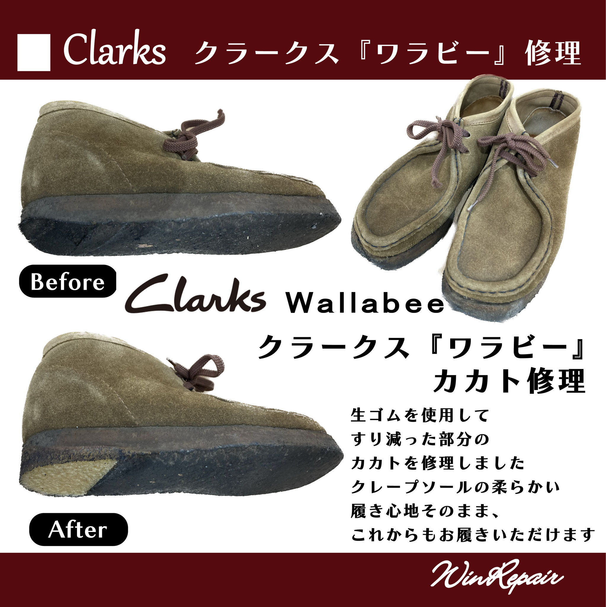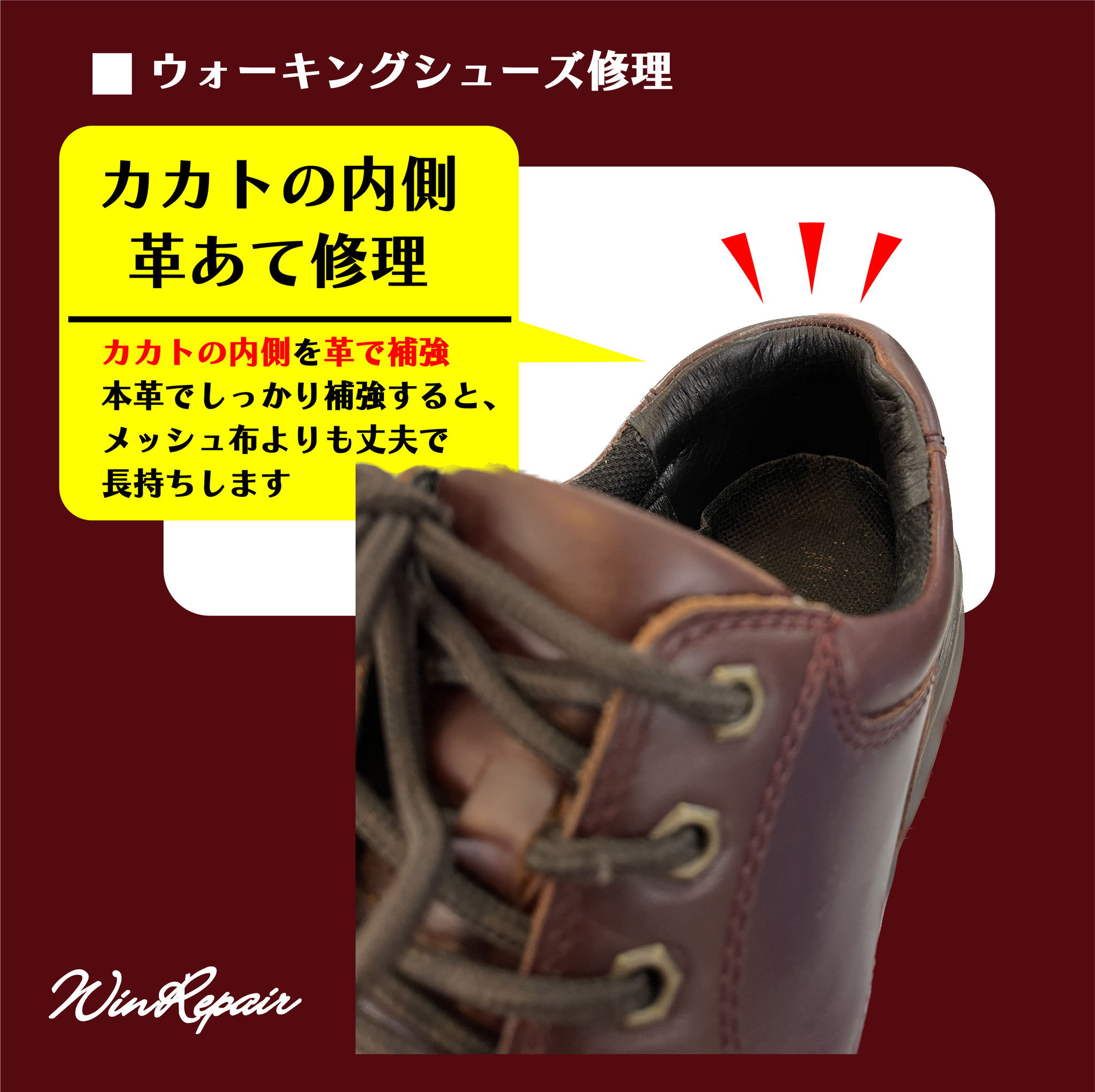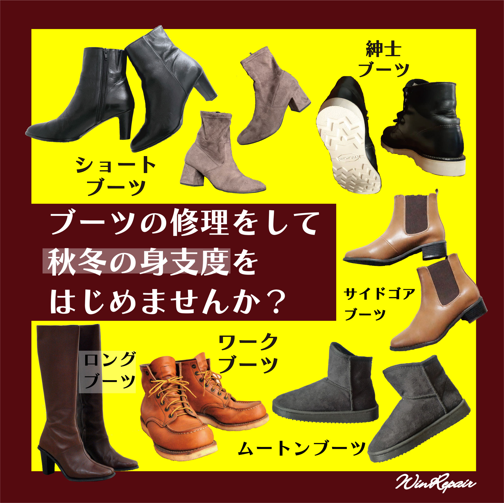 ウィンリペアは「靴」の修理をはじめとして、合カギ作製、カバンの修理、時計の電池交換など様々なサービスをお客様にお届けしています。