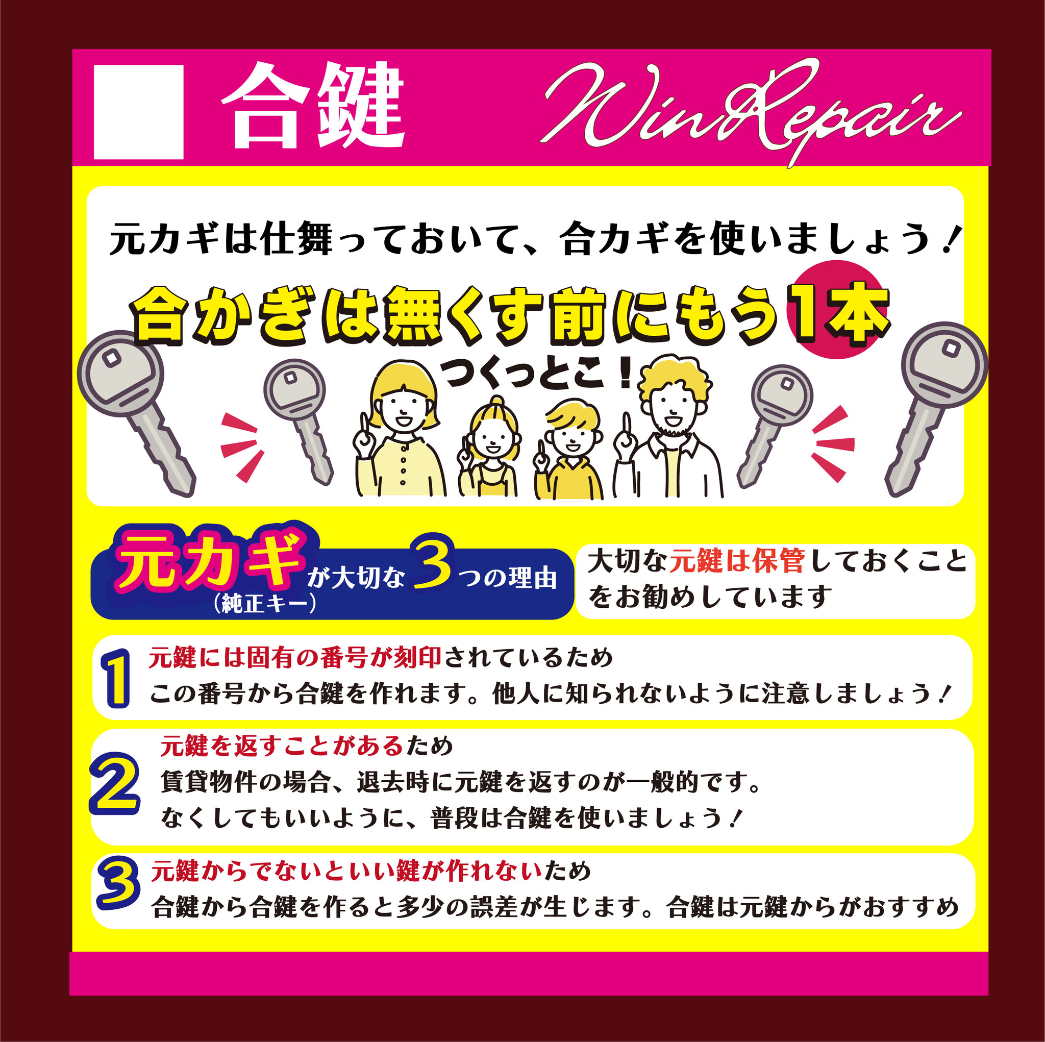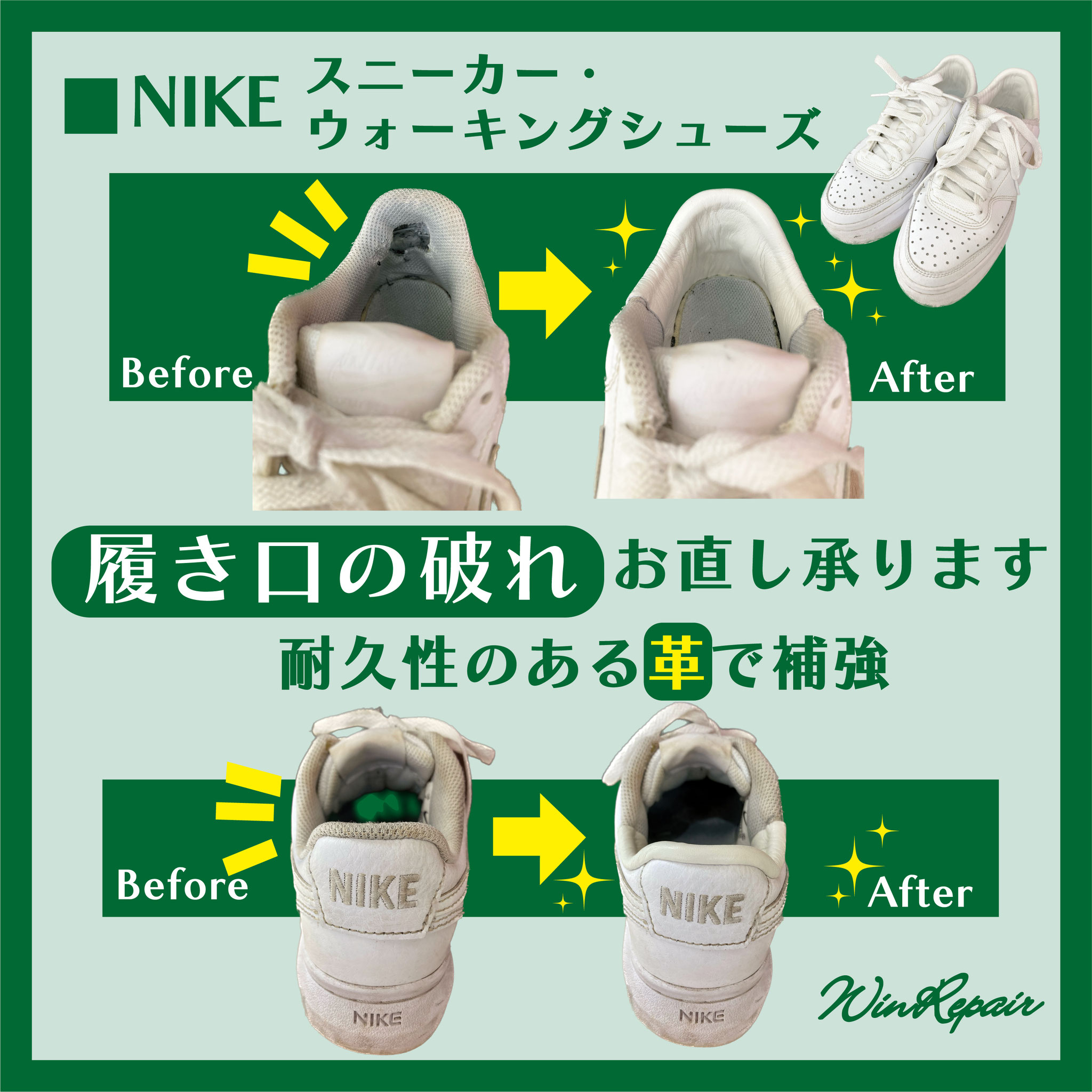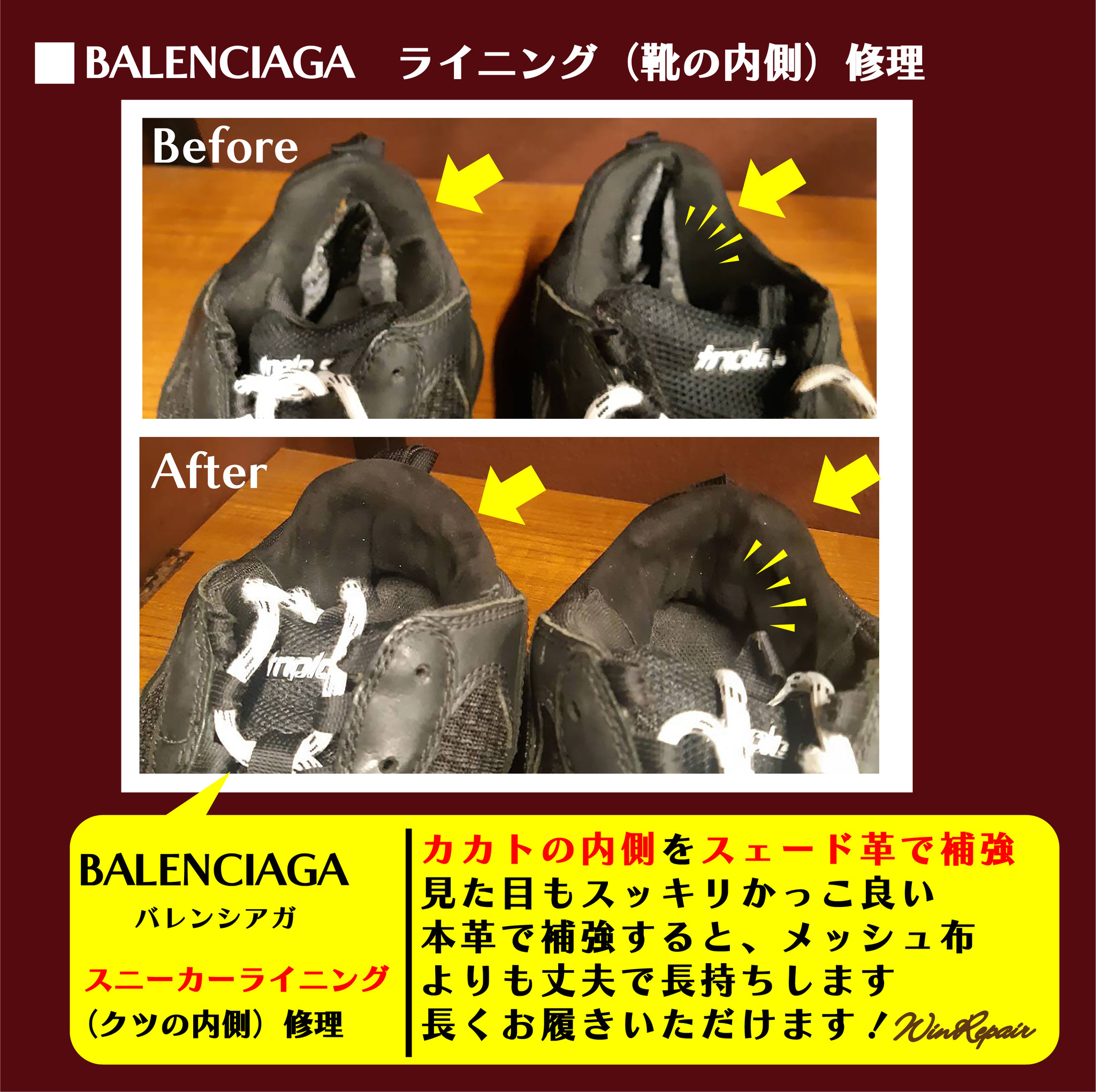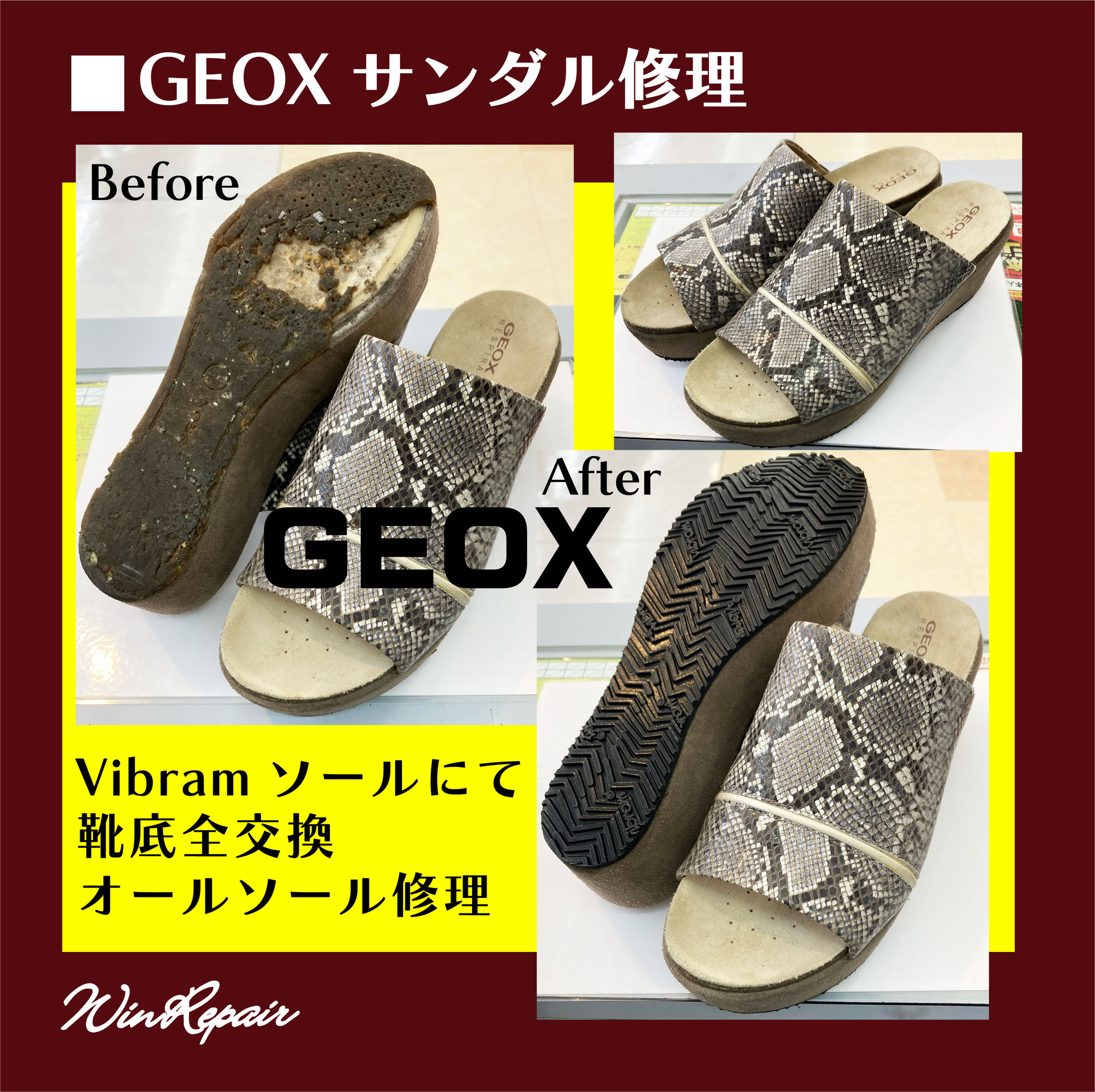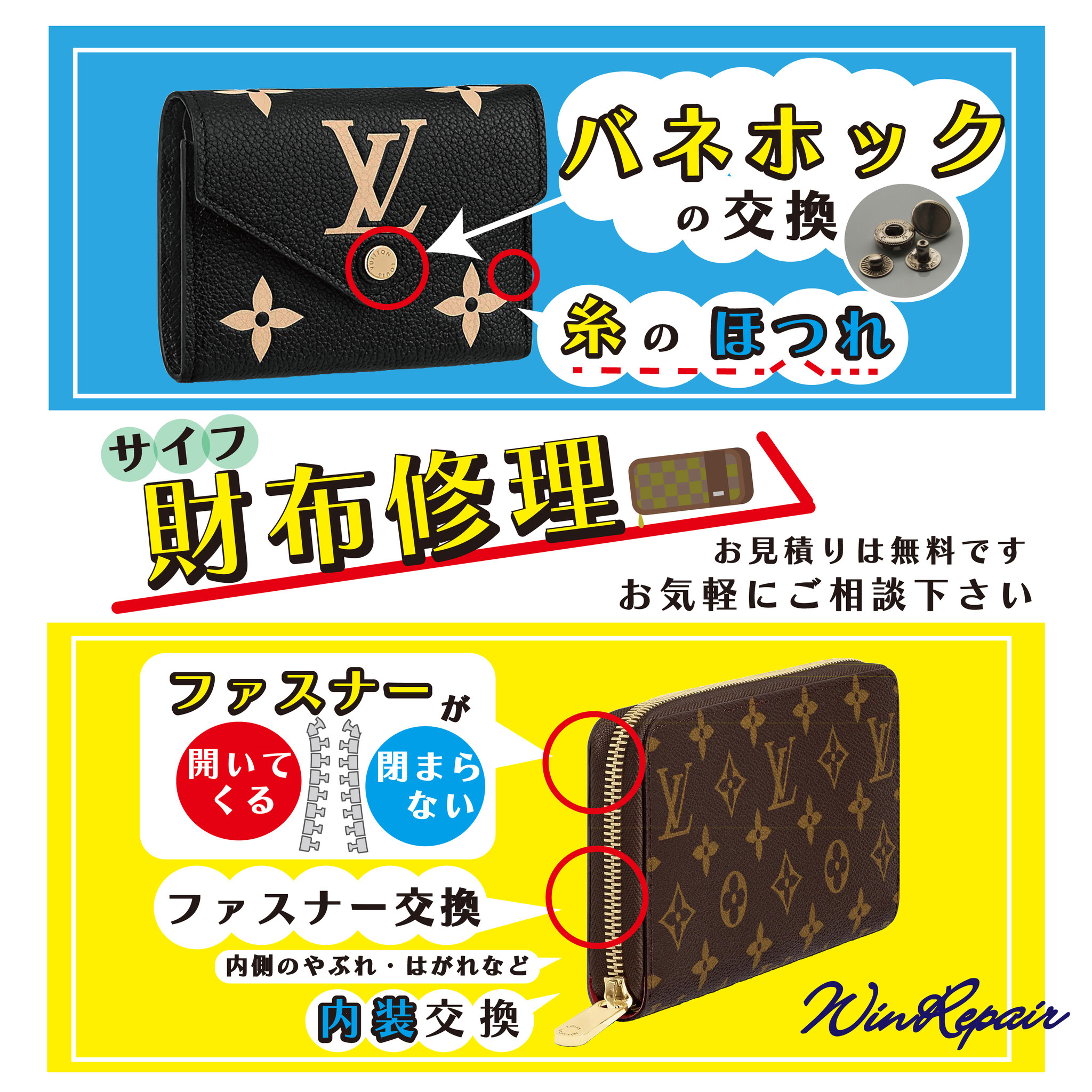 ウィンリペアは「靴」の修理をはじめとして、合カギ作製、カバンの修理、時計の電池交換など様々なサービスをお客様にお届けしています。
